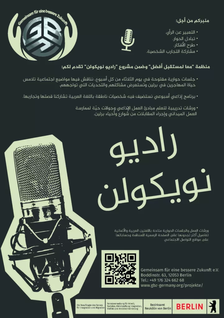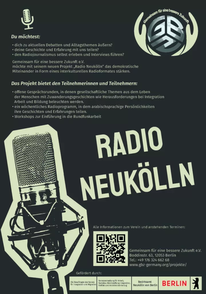 Radio Neukölln ist ein partizipatives Medienprojekt des Vereins Gemeinsam für eine bessere Zukunft e. V. und richtet sich insbesondere an Menschen mit Migrations- und Fluchterfahrung.